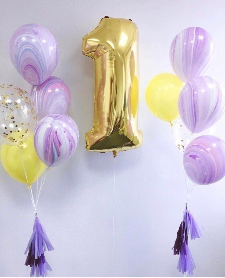 - 2 фонтана на гирлянде по 5 шариков (желтые,мраморные,прозрачные с золотым конфетти)